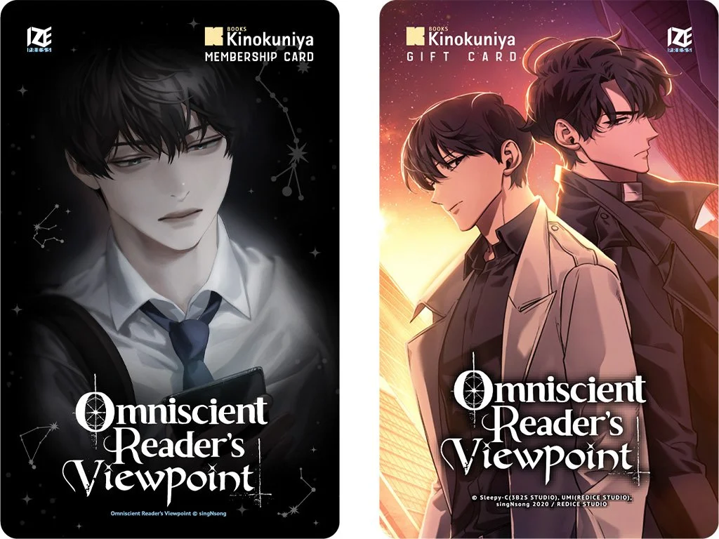 Kinokuniya and Ize Press are teaming up for another Omniscient Reader's Viewpoint collaboration: a new membership card featuring the volume 1 (novel) cover illustration, and a gift card featuring the series’ anime key visual with Dokja and Junghyeok!