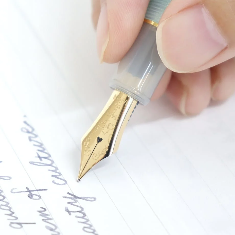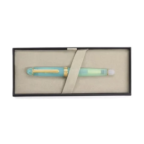 The refreshing minty notes and the cooling sensation of Peppermint tea are characterized in the pen’s translucent blue-green exterior. The base of this fountain pen is modeled after the renowned Platinum 3776 Century, with a mint leaf delicately engraved on the 14K gold nib, adding a charming and luxurious touch to the pen. Be sure to check out the matching ink that was released with the fountain pen!