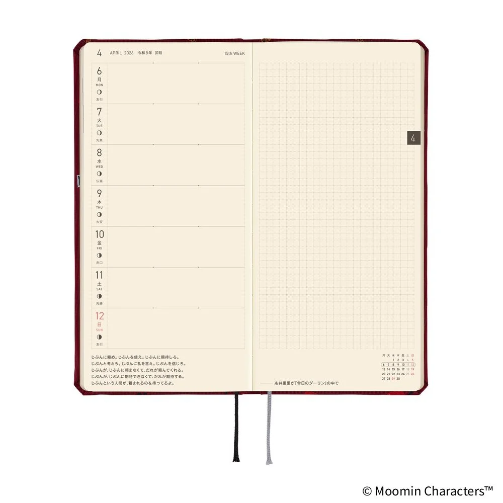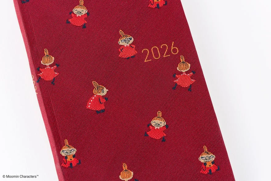This Hobonichi Techo Weeks edition features a charming Moomin design, a clear adhesive corner pocket, and lightweight Tomoe River paper for a smooth writing experience. It is available in both English and Japanese versions and includes a weekly layout, 70 grid memo pages (75 in the English version), and bonus content like Memories 2026 and 12 Switches to Help You Focus.